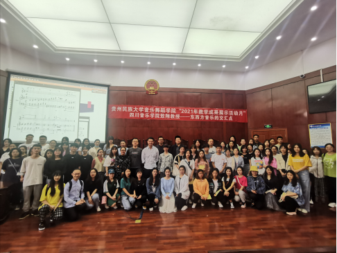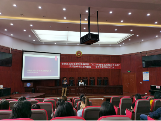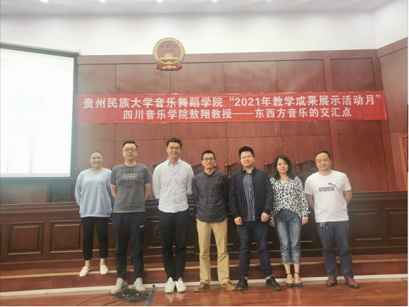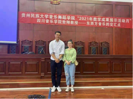2021年5月12日,四川音乐学院副教授敖翔老师应邀赴贵州民族大学音乐舞蹈学院举办讲座——寻找东西方音乐语言的交汇点。讲座中,敖翔老师向同学们讲述了自己的学习经历并分享了他创作的一部分作品。他以自身经历为实例,生动地向学生们讲述了他在创作过程中寻找东西方音乐语言交汇点的心得与体会。同学们纷纷表示,敖老师的讲座使他们受益匪浅。