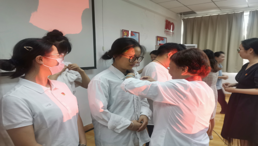 图为周新华老师为我们的党员佩戴党徽