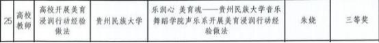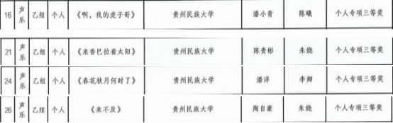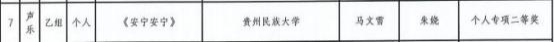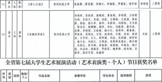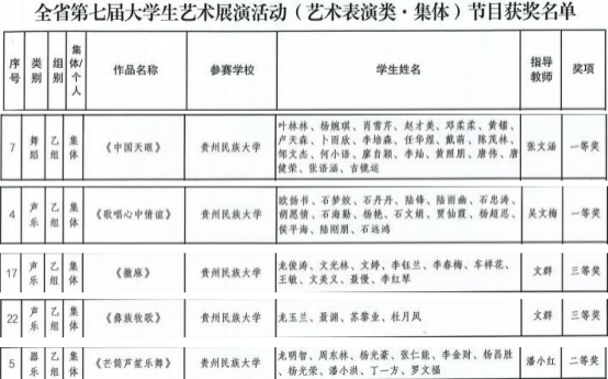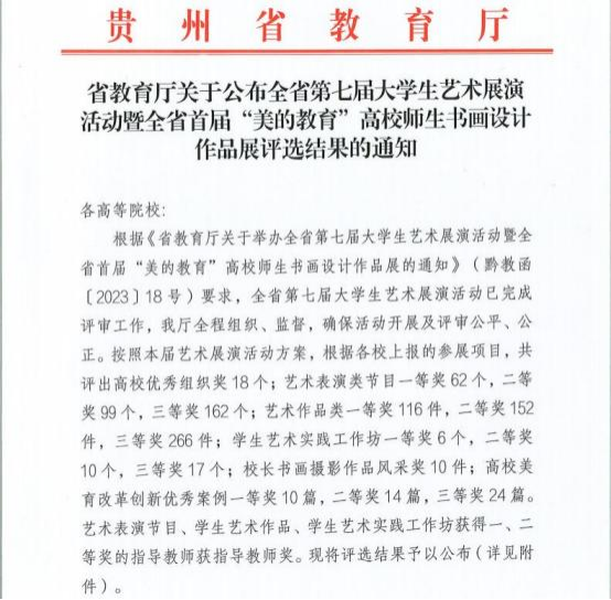 在省教育厅举办的全省第七届大学生艺术展演活动暨全省首届“美的教育 ” 高校师生书画设计作品展活动中,我院各系积极组织师生认真排演参展节目,共 报送了舞蹈《中国天眼》、侗族民歌《歌唱心中谊》、彝族民歌《撒麻》《牧歌》、苗族乐舞《芒筒芦笙乐舞》、民乐合奏《梦入江南》、管乐合奏《欢腾的草原》等 集体项目,5 项学生个人声乐项目,以及 1 项“高校开展美育浸润行动经验做法 ” 等 13 项参加展演与评审,最后获得一等奖 2 项、二等奖 3 项,三等奖 8 项的较好绩。
