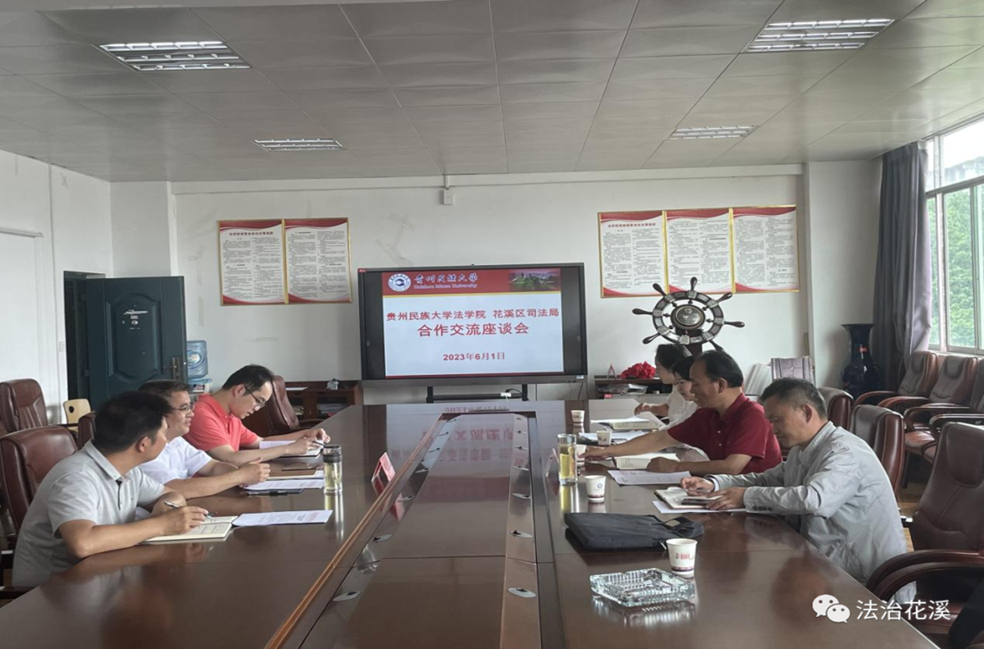 贵州民族大学法学院党委书记柏云兴对花溪区司法局一行的到来表示热烈欢迎,并详细介绍了法学院的基本情况。田景文局长介绍了花溪区在民主法治示范创建、公共法律服务、法治人才培养、社区矫正等方面的工作情况。双方就校地合作共建,推动法治花溪、法治政府、法治社会一体化建设,拓展理论研究领域、搭建法治人才培养平台等方面进行深度探讨,均表达出密切合作、优势互补、实现共赢的意愿。