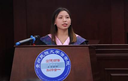 恰同学少年,风华正茂,民大法学院人才辈出,涌现出众多优秀学子,在各自领域内发光发热。毕业生代表胡尚(研究生)、穆河丽(本科生)先后发言。她们回顾了自己在民大法学院的求学历程,讲述了在民大法学院的成长故事,表达了对父母、老师、同学帮助与陪伴的感恩。