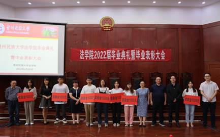 6月22日下午,贵州民族大学法学院2022届毕业典礼暨毕业表彰大会在模拟法庭隆重举行,法学院党委书记张红、副院长(主持工作)俞俊峰、副院长张帆、教师代表出席典礼,2022届毕业生及法学院部分非毕业生参加典礼。毕业典礼由法学院副院长张帆主持。