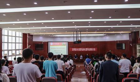 模拟法庭内,毕业生端庄正坐,整齐划一。“全体起立!”在庄严肃穆的国歌声中,法学院2022届毕业典礼拉开了帷幕。